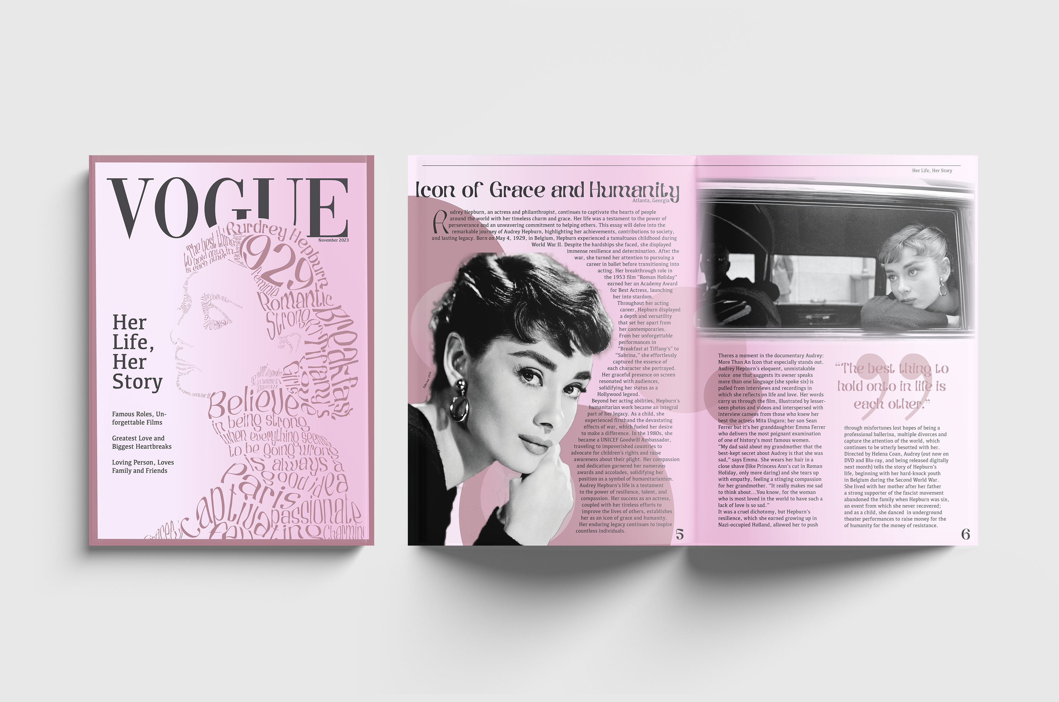 This magazine spread features a Vogue cover and interior layout celebrating Audrey Hepburn, with a silhouette filled with typography and black-and-white photos paired with an article on her legacy.
