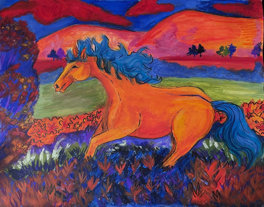 This traditional artwork illustrates a horse gracefully moving through vibrant, colorful fields. The piece captures the beauty of nature and the majesty of the horse, using rich colors and textures to create a lively and engaging scene. The illustration celebrates the harmony between the animal and its environment, showcasing the artist’s skill in blending traditional techniques with a vivid palette.